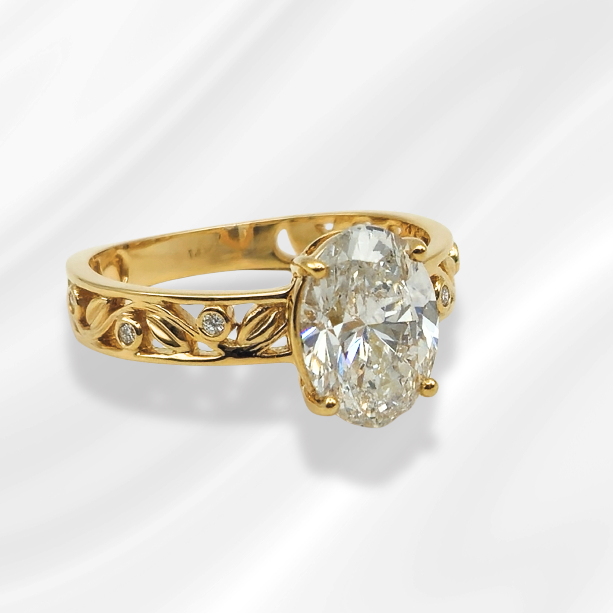 This 14K yellow gold engagement ring showcases a stunning lab-grown 10x8mm Oval diamond that radiates brilliance and clarity. The warm gold band is beautifully detailed with subtle accents, adding dimension and sparkle while keeping the overall design timeless and elegant.