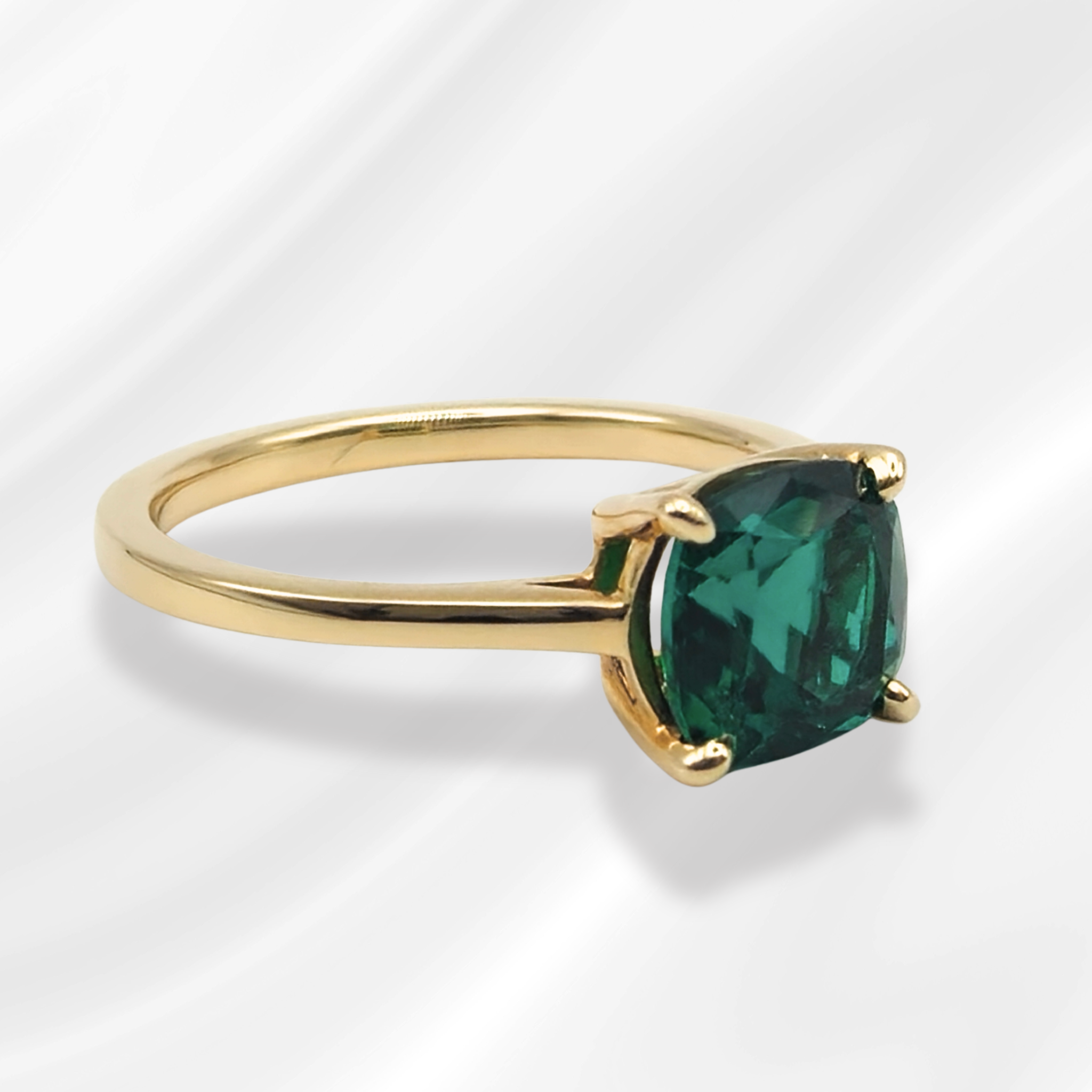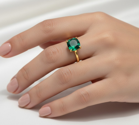 Designed as a ready-to-wear fashion ring, this piece is sold as is, making it an effortless statement for everyday elegance or special occasions. The cushion cut adds a soft, timeless charm, while the lab-grown emerald offers a conscious and contemporary approach to fine jewelry.