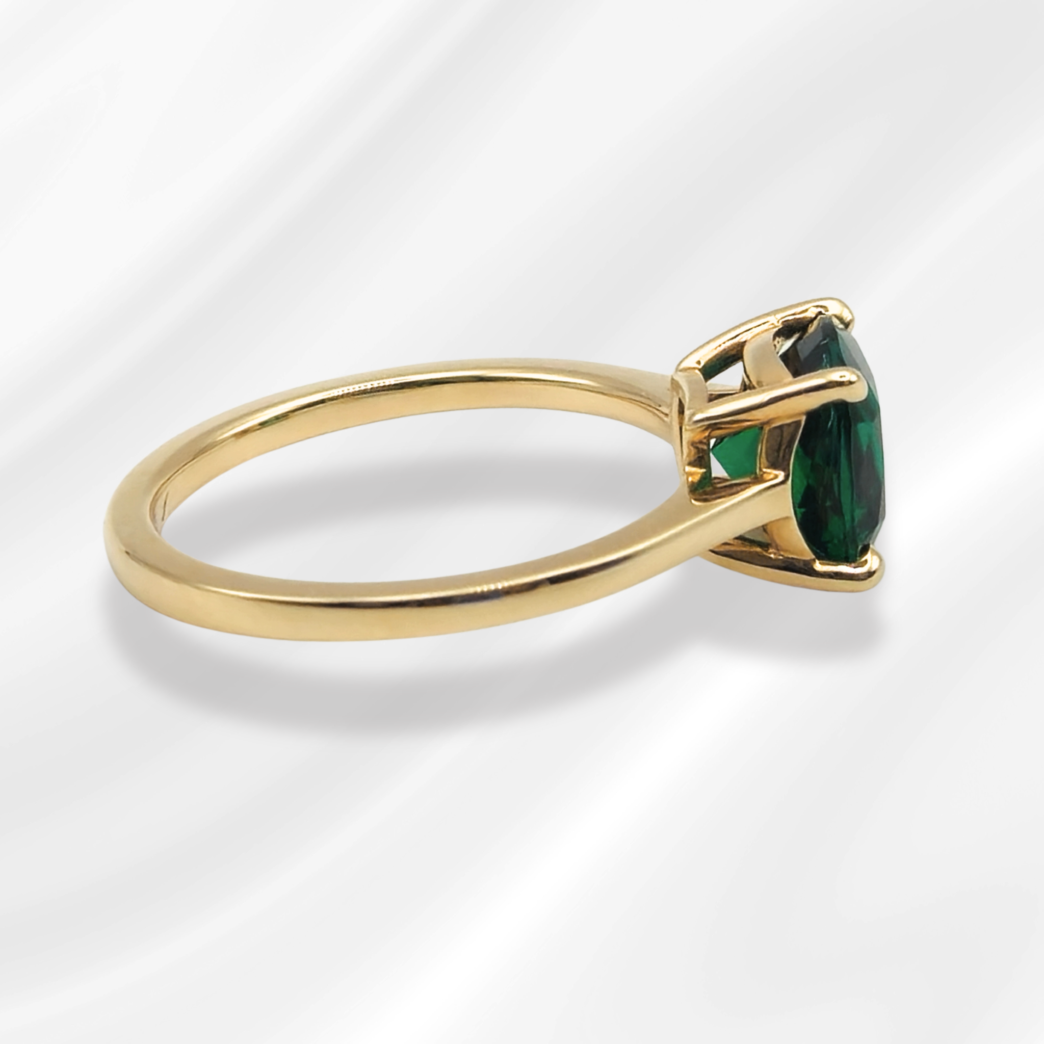 A striking example of a lab emerald ring in yellow gold, this design blends classic luxury with bold color—perfect worn alone or stacked for a layered look.
